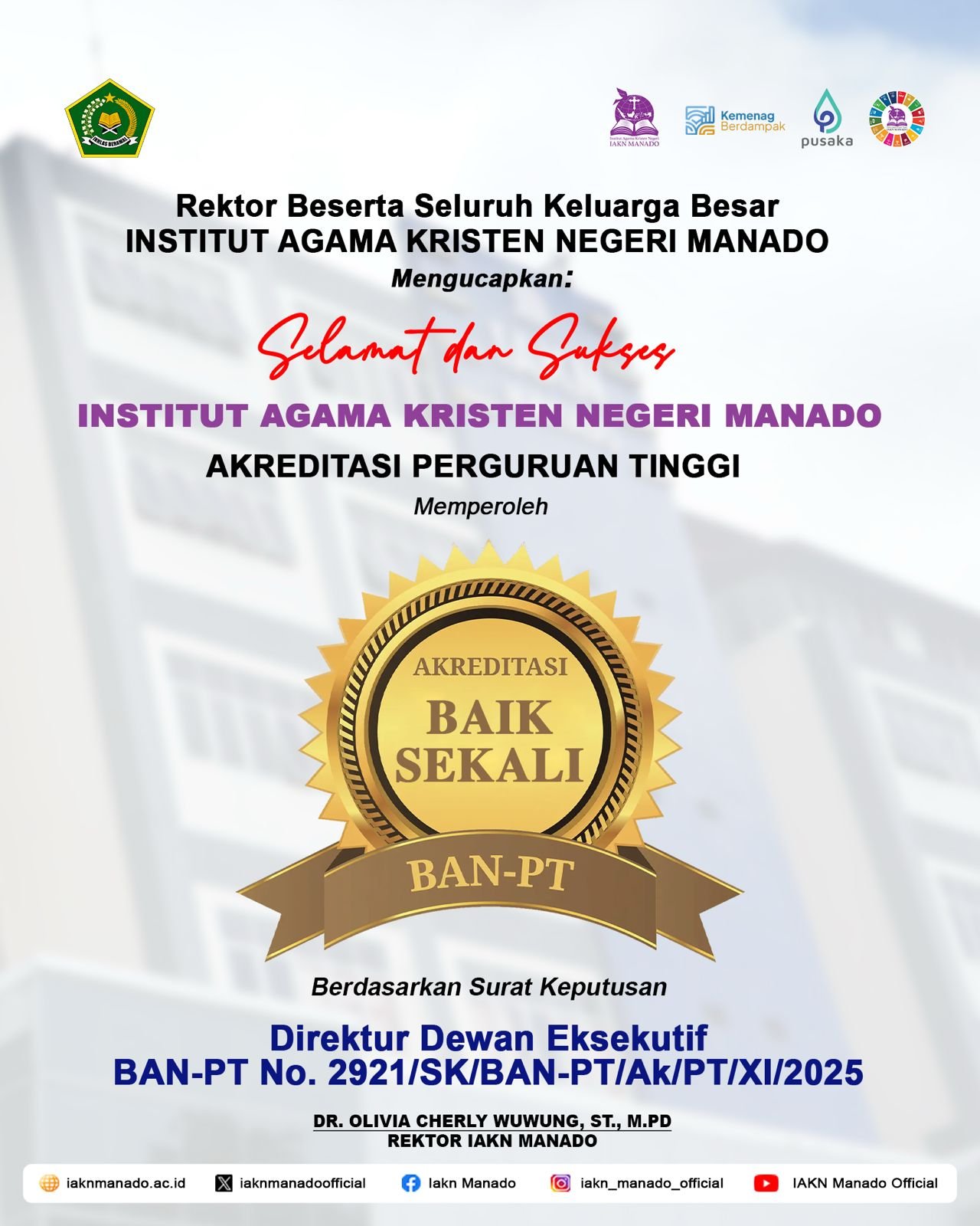 MANADO – Institut Agama Kristen Negeri (IAKN) Manado kembali menorehkan pencapaian membanggakan dalam peningkatan mutu dan tata kelola pendidikan tinggi. Berdasarkan Surat Keputusan Direktur Dewan Eksekutif BAN-PT Nomor 2921/SK/BAN-PT/Ak/PT/XI/2025, IAKN…