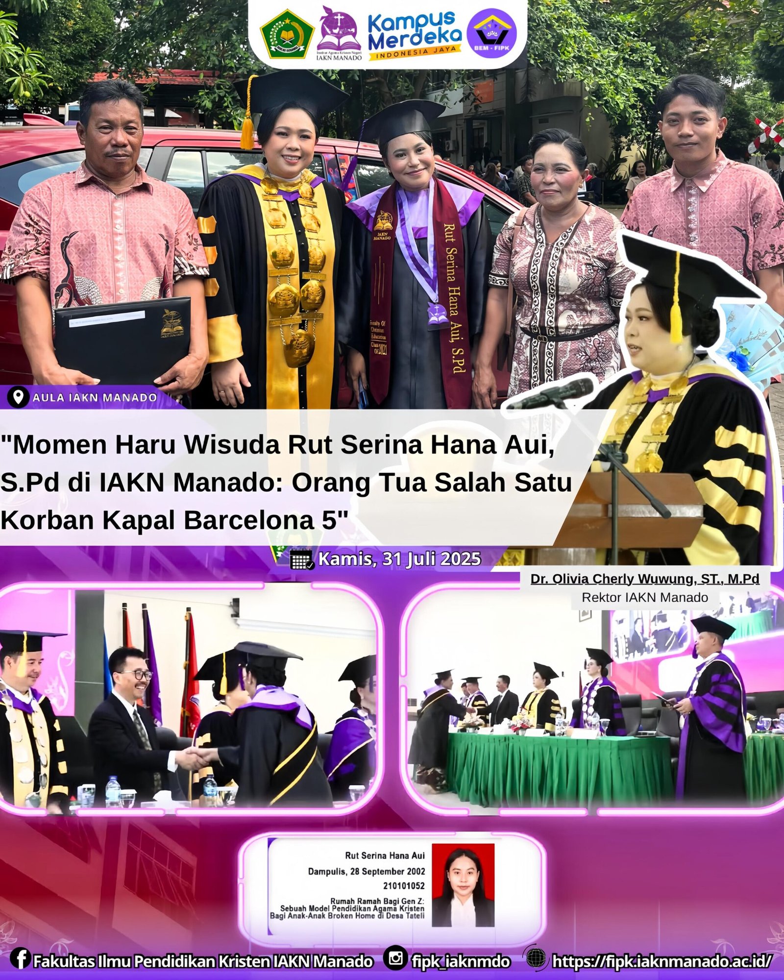 𝗠𝗮𝗻𝗮𝗱𝗼, 𝟯𝟭 𝗝𝘂𝗹𝗶 𝟮𝟬𝟮𝟱— Hari Kamis pagi di Aula IAKN Manado dipenuhi rasa haru dan bangga. Rut Serina Hana Aui, S.Pd mahasiswi Program Studi Pendidikan Agama Kristen FIPK, resmi dikukuhkan…