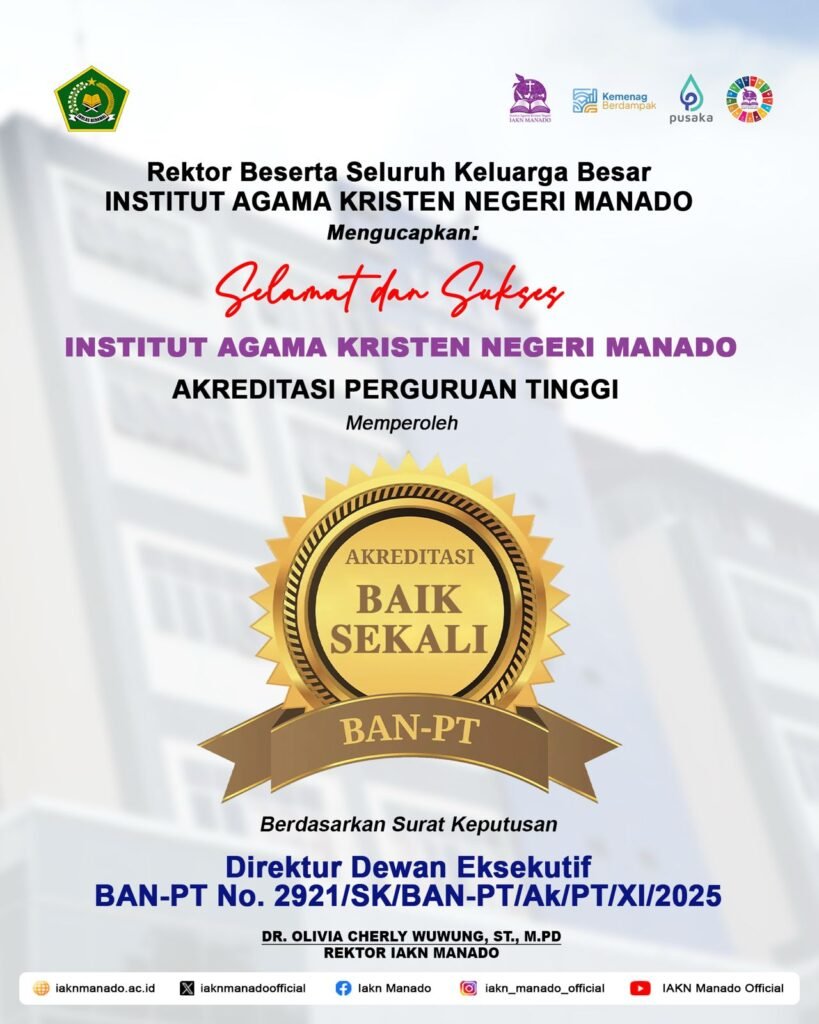 MANADO – Institut Agama Kristen Negeri (IAKN) Manado kembali menorehkan pencapaian membanggakan dalam peningkatan mutu dan tata kelola pendidikan tinggi. Berdasarkan Surat Keputusan Direktur Dewan Eksekutif BAN-PT Nomor 2921/SK/BAN-PT/Ak/PT/XI/2025, IAKN Manado resmi memperoleh Akreditasi Perguruan Tinggi dengan peringkat “Baik Sekali”.