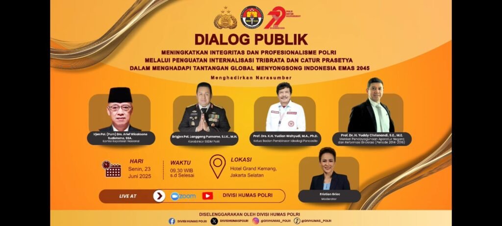 Manado, IAKN Manado – Institut Agama Kristen Negeri (IAKN) Manado menunjukkan komitmennya dalam bersinergi membangun bangsa dengan berpartisipasi aktif dalam kegiatan Dialog Publik yang diselenggarakan oleh Kepolisian Negara Republik Indonesia. Dialog yang mengusung tema “Meningkatkan Integritas dan Profesionalisme Polri Melalui Penguatan Internalisasi Tribrata dan Catur Prasetya dalam Menghadapi Tantangan Global Menyongsong Indonesia Emas 2045” ini digelar secara hybrid pada Senin, 23 Juni 2025.