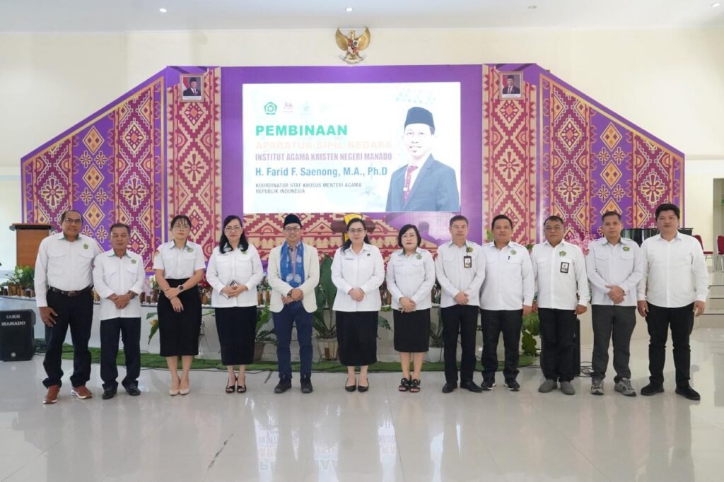 Manado — Institut Agama Kristen Negeri (IAKN) Manado menerima kunjungan kerja Koordinator Khusus Staf Khusus Menteri Agama Republik Indonesia, H. Farid F. Saenong, M.A., Ph.D., dalam kegiatan Pembinaan Aparatur Sipil Negara (ASN) yang dilaksanakan di Aula IAKN Manado, Senin (2/2/2026) dan diikuti oleh seluruh ASN di lingkungan IAKN Manado.