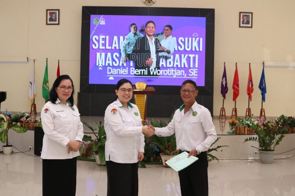 Dalam acara tersebut, Rektor IAKN Manado Dr. Olivia Cherly Wuwung, S.T., M.Pd., didampingi Kepala Biro AUAK Pdt. Anneke M. Purukan, S.PAK., M.Pd., menyerahkan SK Purnabakti kepada Bapak Daniel Berni Worotitjan, S.E.