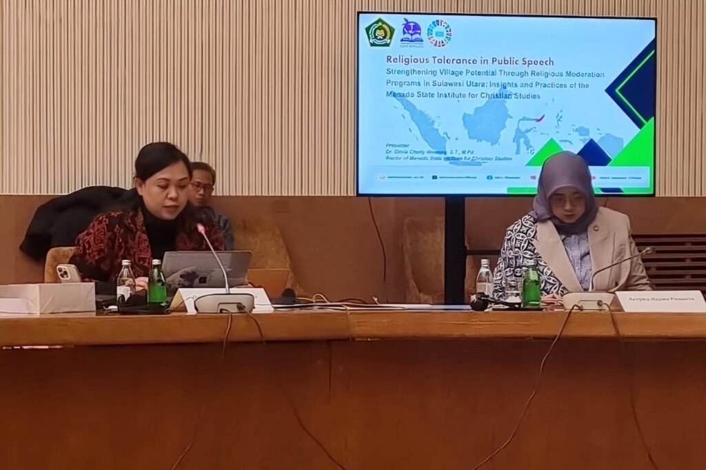 Rektor memaparkan program Religious Moderation Village atau Desa Moderasi Beragama yang dipimpin oleh IAKN Manado di Sulawesi Utara sebagai salah satu contoh konkret dalam memperkuat toleransi dan kohesi sosial.