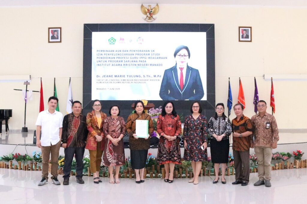 Minahasa, 7 Juni 2025 — Bertempat di aula IAKN Manado, Direktorat Jenderal Bimbingan Masyarakat Kristen Kementerian Agama Republik Indonesia secara resmi menyerahkan Surat Keputusan (SK) Izin Penyelenggaraan Program Studi Pendidikan Profesi Guru (PPG) Keagamaan untuk Program Sarjana kepada Institut Agama Kristen Negeri (IAKN) Manado.