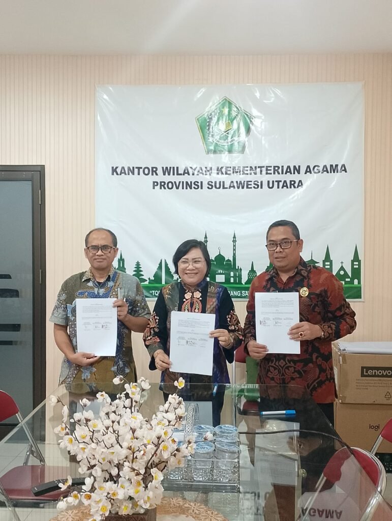 Penandatanganan tersebut dilakukan oleh Kabag Tata Usaha Kanwil Kemenag RI Provinsi Sulawesi Utara, Basri, M.Ag., M.Pd., Ketua Rumah Moderasi Beragama IAKN Manado, Dr. Anita I. Tuela, M.Th., dan Ketua Rumah Moderasi Beragama IAIN Manado, Ali Amin, Ph.D.